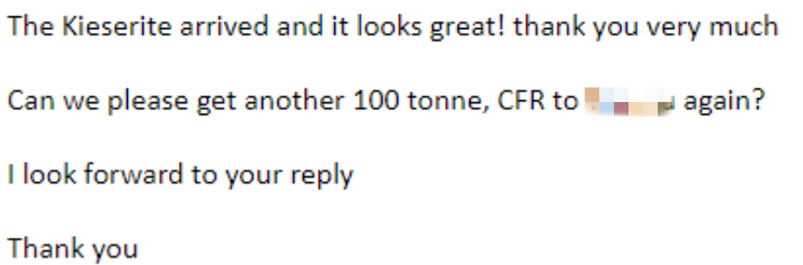 Earlier this season, we delivered a shipment of Kieserite to a valued client in New Zealand. As with every order, we paid close attention to quality control, timely shipping, and communication throughout the process. When the cargo finally arrived, we were pleased to receive positive feedback: “The Kieserite arrived and it looks great! Thank you very much.”